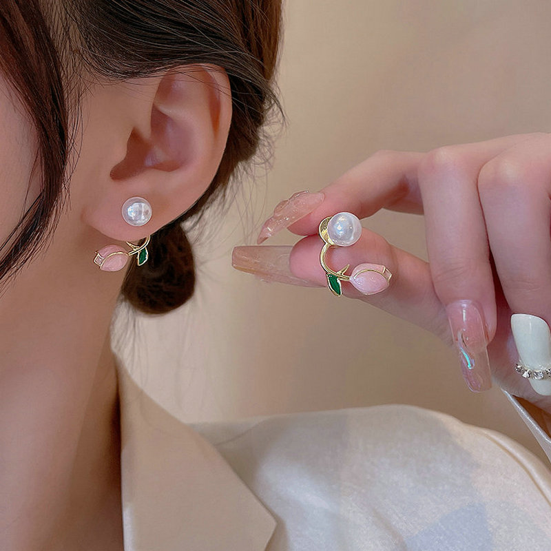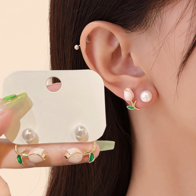 Style Tulip Flower Pearl Earrings Summer Silver Ne..